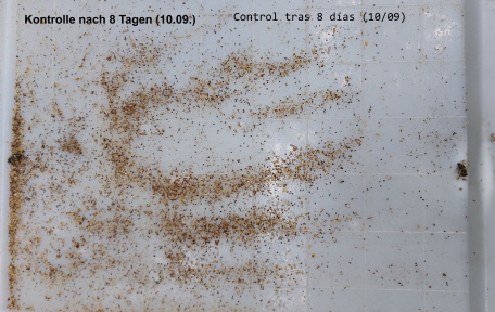 Después de 24 horas, había aproximadamente entre 90 y 100 ácaros en la tabla de control (véase más abajo).